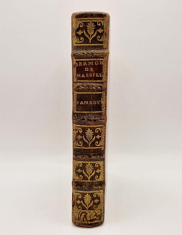 "Édition originale de ces modèles d'éloquence sacrée. Portrait frontispice de l'auteur, dans un médaillon ovale, et cinq vignettes d'en-tête, gravés en taille-douce. L'ouvrage comprend six sermons (sur la Cène - prêché devant Louis XIV -, l'Assomption, la Passion, etc.), quatre panégyriques (St. Louis, St. François, St. Charles, St. Vincent de Paul), trois oraisons funèbres (dont celle de Louis XIV), treize instructions pastorales et mandements (sur l'établissement des Dames de la Charité, la grossesse de la Reine, des prières publiques pour la conservation du roi, le Te Deum pour la prise de Furnes, etc.), ainsi que douze pièces académiques (dont les Discours ayant remporté le prix d'éloquence de l'Académie française en 1697, 1699 et 1701). Prédicateur attaché à la maison de Condé, académicien et évêque de Bazas, Edme Mongin (1668-1746) fut l’un des prédicateurs renommés de son temps. La réunion des œuvres de cet orateur chrétien en un seul volume parait illustrer à merveille l'injonction qu'il adressait à un collègue trop prolixe à son goût : ""Parlons beaucoup, mais écrivons peu"" ! Très bel exemplaire sur grand papier en maroquin aux armes de la duchesse de Montmorency-Luxembourg. Arrière petite-fille du ministre de Louis XIV, Marie-Sophie-Honorate Colbert (1712-1747) épousa en 1724 Charles François Frédéric de Montmorency-Luxembourg, gouverneur de Normandie puis maréchal de France. Les coiffes ont été restaurées. Olivier, Hermal et Roton, Manuel de l'amateur de reliures armoriées françaises, 829."