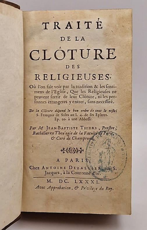 Paris, Antoine Dezallier, 1681 [édition originale] ; in-12 relié plein veau glacé de l'époque, dos à nerfs richement orné, roulette sur les champs, bandeaux, tampon, (24)-508 pp. Bel exemplaire de cet ouvrage aujourd'hui peu courant, comme beaucoup de traités du père Jean-Baptiste Thiers.