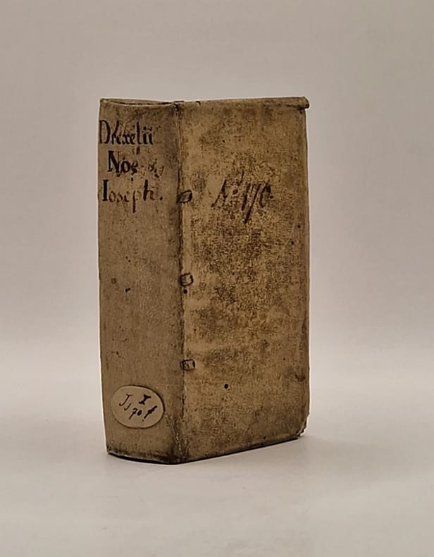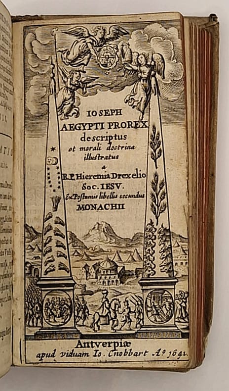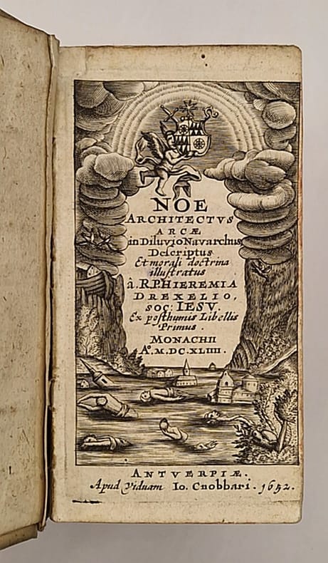 Anvers, Io. Cnobbari [Joannes Cnobbaert], 1652 et 1641 ; deux ouvrages reliés en un in-16 plein vélin de l'époque à rabats, auteur et titres manuscrits, et petite étiquette au dos, tranches rouges portant une inscription manuscrite en partie effacée, deux beaux titres-frontispices, l'un représentant le déluge et l'autre une scène de la vie de Joseph, tampons, (8)-232-(12)-321 pp. Jérémie Drexel (1581-1638), orateur sacré de renom converti au catholicisme, a grandement influencé la spiritualité allemande de son époque.