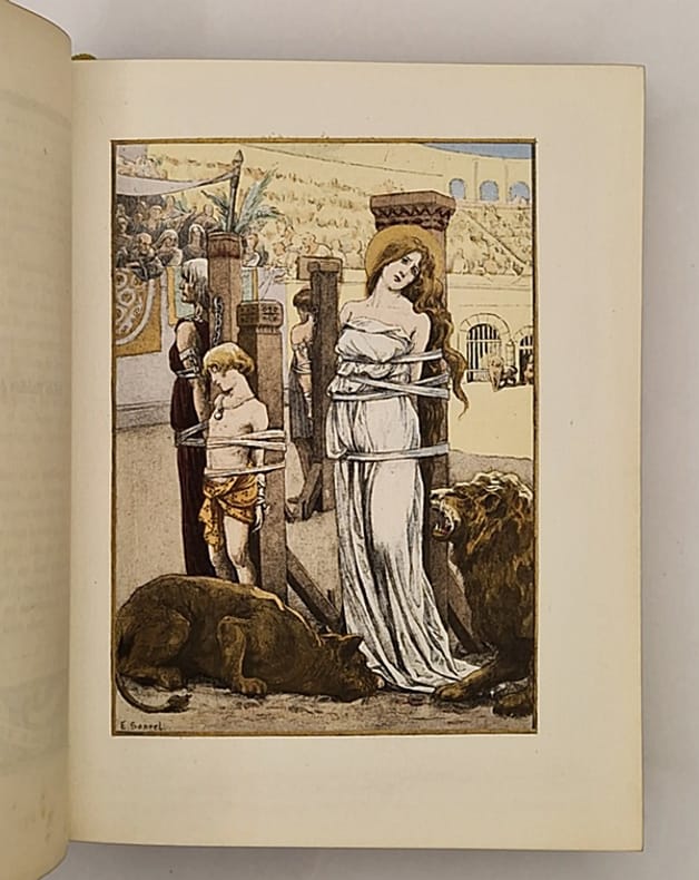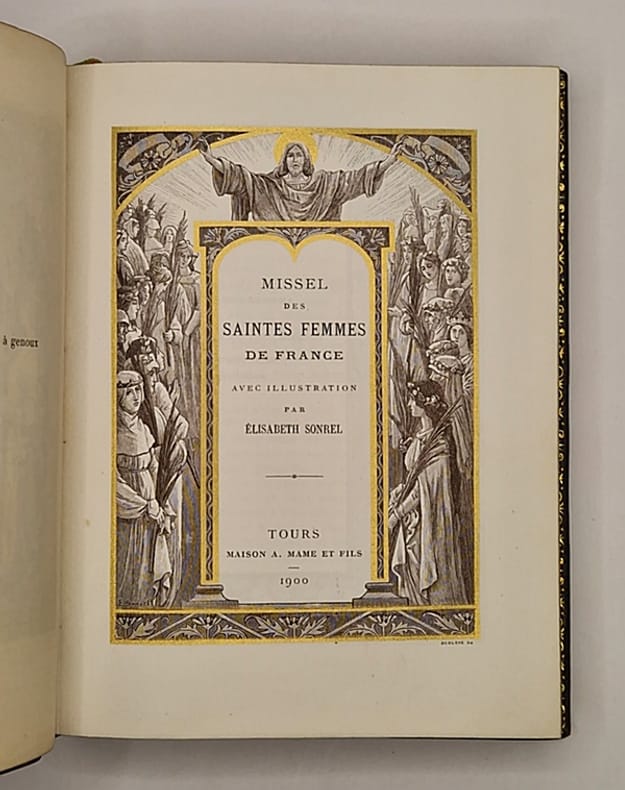 Tours, Alfred Mame et Fils, 1900 ; in-8° relié plein maroquin brun, dos plat, tranches dorées et marbrées, large dentelle intérieure, gardes de moire kaki, quelques rares rousseurs éparses, 319 pp. Ce bel ouvrage illustré avec élégance par Mademoiselle Sonrel présente dix superbes gravures chromolithographiées (dont le frontispice). On trouve à chaque page un large encadrement en équerre comportant un décor floral et une vignette représentant une femme illustre de la chrétienté (sainte, religieuse ou mystique) à l'encre brune, sépia ou bleutée avec rehauts dorés.