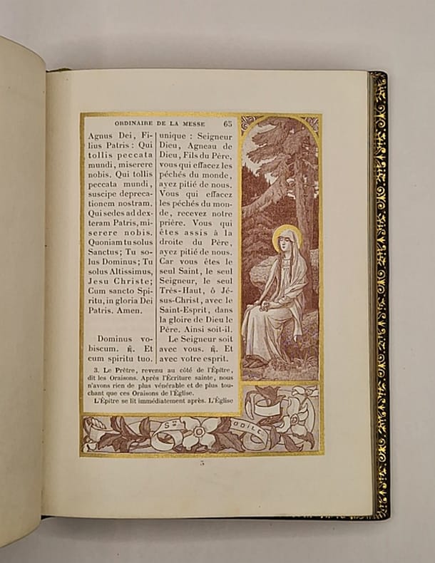 Tours, Alfred Mame et Fils, 1900 ; in-8° relié plein maroquin brun (légèrement frotté par endroits), dos lisse, tranches dorées et marbrées, large dentelle intérieure, gardes de moire beige, 319 pp. Ce bel ouvrage illustré avec élégance par Mademoiselle Sonrel présente dix superbes gravures chromolithographiées hors texte (dont le frontispice). On trouve à chaque page un large encadrement en équerre comportant un décor floral et une vignette représentant une femme illustre de la chrétienté (sainte, religieuse ou mystique) à l'encre brune, sépia ou bleutée avec rehauts dorés.