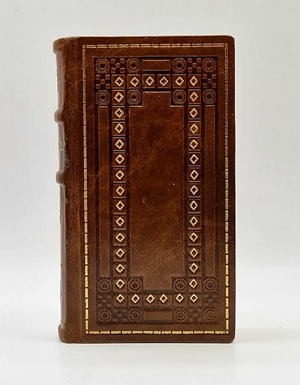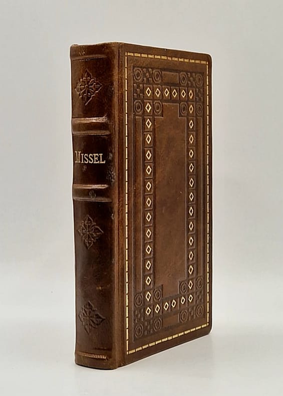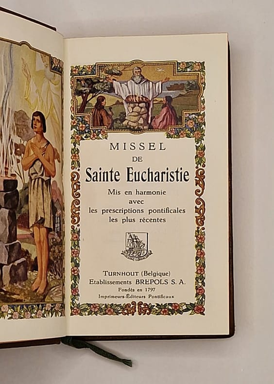 Ouvrage plein cuir avec motifs entretenu à la cire 213 de la BnF ; porte la vignette de "Librairie-papeterie A, Pochelou, Saint-Jean-de-Luz, Basses-Pyrénées" ; PM-MISS-27, Etablissements Brépols, Turnhout 1935