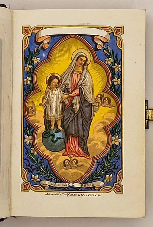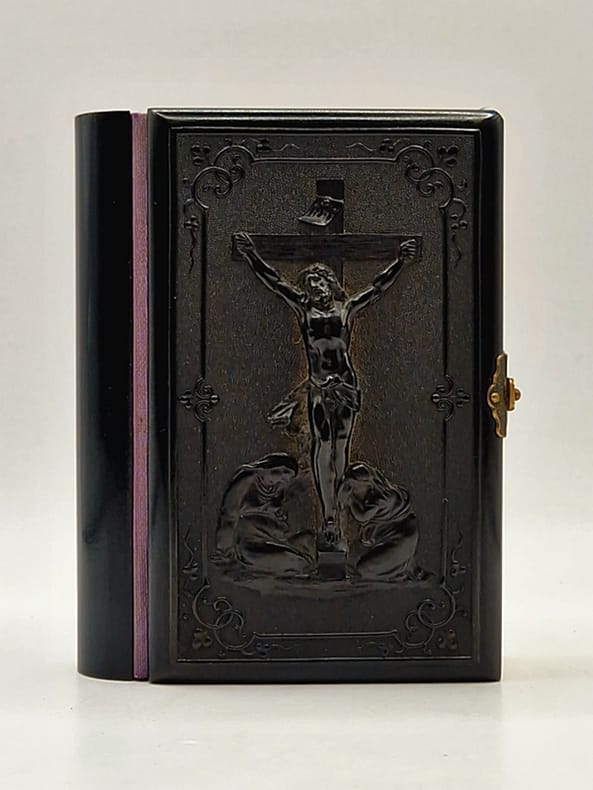 Paris, Laplace, Sanchez et Cie, 1856 ; in-16 pleine reliure ébonite, dos lisse, plat supérieur orné d'une représentation en haut-relief du Christ en croix avec Marie Madeleine et la Vierge Marie à ses pieds, second plat orné d'un encadrement végétal, fermoir métallique ouvragé, tranches dorées, gardes de moire mauve, deux frontispices dont un chromolithographié par Engelmann, trois gravures hors texte signées « Wolff », 512 pp. Bel exemplaire.