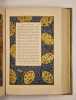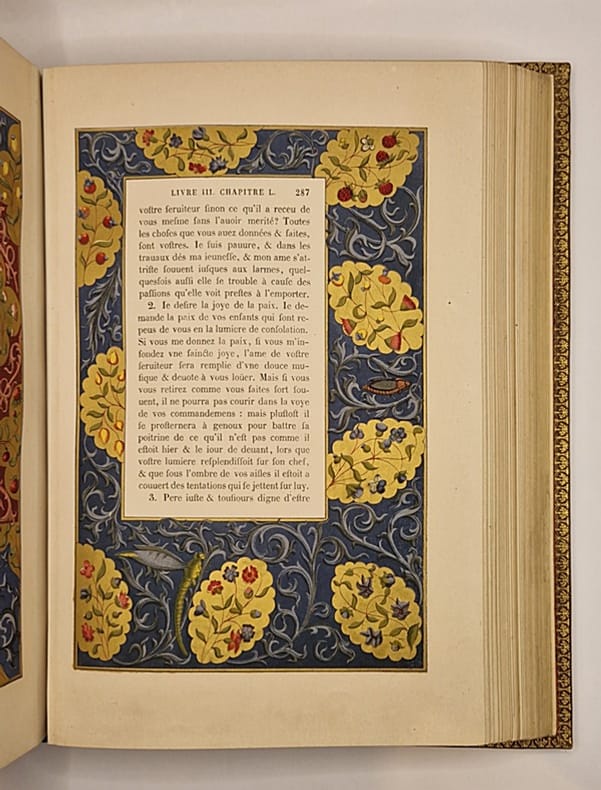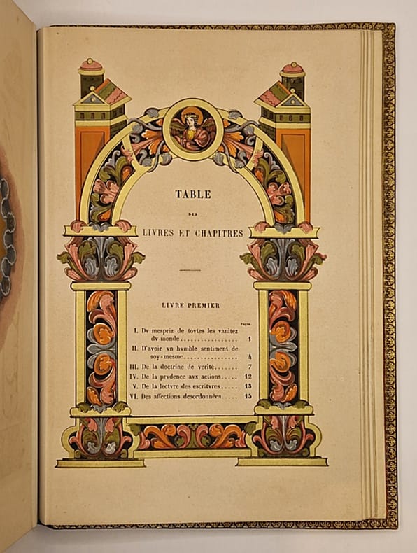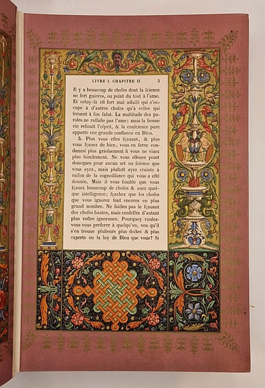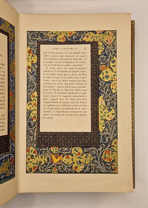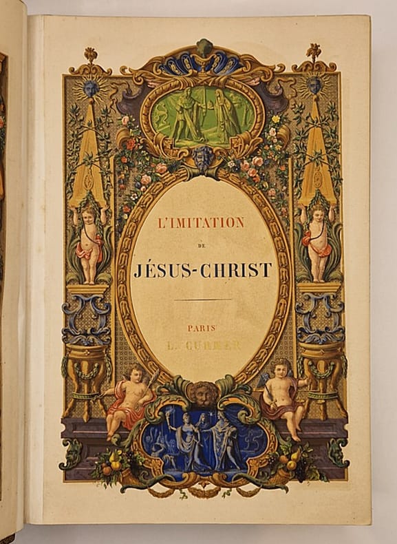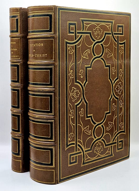 Imitation. Paris, Léon Curmer, 1856 ; fort in-8° relié plein maroquin cannelle, dos à nerfs orné, plats entièrement ornés d'entrelacs noir et or avec motifs végétaux, tranches dorées, gardes de moire vieux rose et large roulette intérieur portant signature « L. Curmer », (8)-XII-(3)-399-(3)-XIV pp. Faux-titre, grande vignette indiquant le nom du chromolithographe (Lemercier) et du typographe (J. Claye), magnifiques frontispice et titre-frontispice, grand ex-dono imprimé en couleurs, page de remerciement de Léon Curmer aux « Amis des arts », texte de la page de titre de l'Imitation publiée par Nicolas Gasse en 1626, très beau frontispice représentant Anne de Bretagne en prière avec rehauts d'or, quatre planches pleine page au début de chacun des quatre livres de l'Imitation. Toutes pages montées sur onglet, pourvue chacune d'un large encadrement en couleurs d'inspiration médiévale. Cet ouvrage a nécessité l'utilisation de plus de neuf cents pierres lithographiques, de trois à quatorze couleurs, et constitue l'une des plus belles productions de Léon Curmer. Appendice. Paris, Léon Curmer, 1858 ; in-8° relié demi-maroquin cannelle, dos à nerf orné, plats de toile, tranches dorées, rousseurs éparses (dans ce volume uniquement), culs-de-lampe et belles lettrines dans le texte et trois portraits contrecollés hors texte, texte du catalogue encadré de guirlandes végétales, pages de l'Index des manuscrits et imprimés encadrées de figures tirées du Triomphe de la mort gravées d'après les dessins originaux de Jean Holbein et d'autres figures, toutes pages montées sur onglets, 143-51-(16) pp. Magnifique exemplaire dans son grand coffret d'origine (clé de fermeture absente).