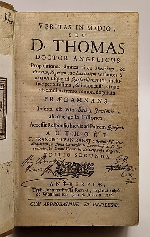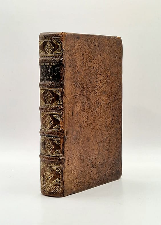 Anvers, Joannis Pauli Robyns, 1718 et 1712 ; deux ouvrages reliés en un in-12 plein veau de l'époque, dos à nerfs richement orné (légèrement frotté, petite épidermure sur un mors, sans fragilité), tranche mouchetée de rouge, ex-libris moderne et tampons, bandeaux, culs-de-lampe et lettrines, belle vignette gravée représentant saint Thomas d'Aquin en page de titre du second ouvrage, (6)-292-(12)-16-149-(1) pp.