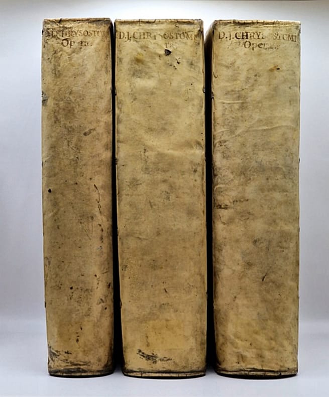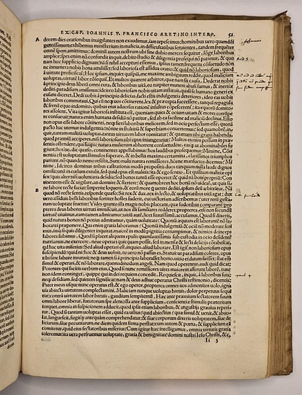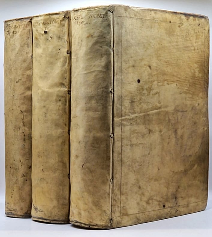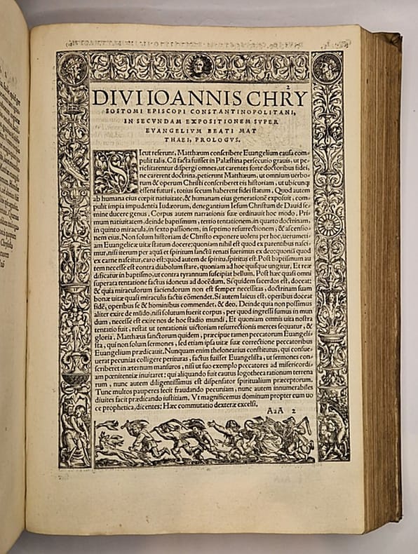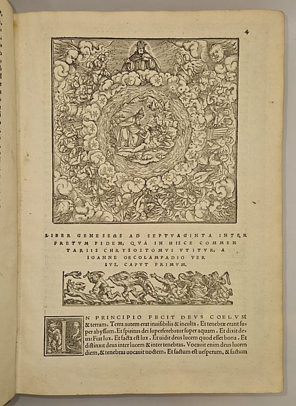 Bâle, Apud Andream Cratandrum [Andreas Cratander], 1525 (post-incunable) ; sept tomes reliés en trois in-4° plein vélin d'une sobriété toute cistercienne (reliure sans doute légèrement postérieure, plats et dos patinés, quelques épidermures), dos rond portant trace manuscrite de l'auteur et du titre, ex-libris modernes et anciens (certains anciennement masqués d'une bande de papier), tampons, annotations manuscrites, fines et très anciennes, en marge de nombreuses pages, (38)-208-122, 169-146-181-(3) et 291-175-(25) ff. Complet. Belles marques de l'imprimeur gravées en début et en fin d'ouvrage – représentations allégoriques du concept de kairos comportant de légères variations –, nombreuses lettrines gravées sur bois, une grande et belle vignette allégorique représentant la création d'Ève à partir de la côte d'Adam accompagnée d'un concert des anges, bandeau gravé représentant un ensemble de paysan pourchassant un renard tenant en sa gueule un canard, trois larges et beaux encadrements gravés en taille d'épargne.