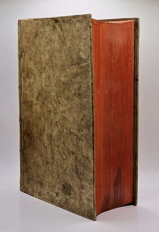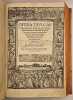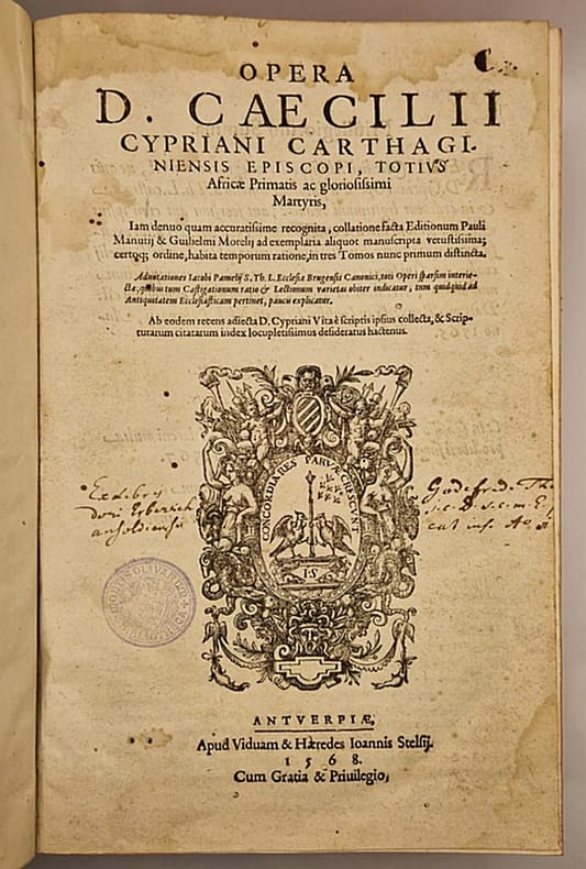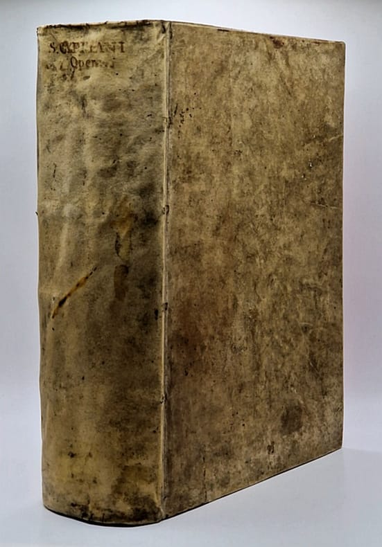 Deux ouvrages (dont le premier en trois tomes) reliés en un fort volume in-4° plein vélin, dos plat portant auteur et titre manuscrits, tranches rouges, ex-libris ancien et moderne. Les deux ouvrages semblent avoir été placés, au XIXe siècle, dans une reliure de vélin XVIIe – tous deux, tout particulièrement le second, ont vu leurs marges rognées et leurs tranches rougies. Pour le premier ouvrage : Anvers, Johannes Steelsius, 1568 ; trois tomes reliés en un volume, ex-libris ancien et tampon, grande et belle marque de l'imprimeur gravée en page de titre, mouillure claire en marge supérieure de plusieurs feuillets, fines et anciennes inscriptions manuscrites sur de nombreux feuillets, lettrines et culs-de-lampe, (108)-607-(2) pp. (pagination continue pour les trois tomes). Pour le second ouvrage : Bâle, Apud Inclytam Basileam ex Officina Frobeniana [Froben], 1521 ; ex-libris ancien et tampons, bandeaux et belles lettrines (dont certaines historiées), quelques inscriptions manuscrites anciennes dans les marges. Beau et grand titre-frontispice historié typique de l'humanisme allemand du XVIe siècle, signé Ambrosius Holbein (monogramme) et daté 1517. On y trouve des représentations de la bataille de Teutobourg, les vertus sous forme allégorique et la calomnie d'Apelle. Le titre-frontispice est suivi par un bel encadrement gravé en première page de la préface ; on trouve en fin d'ouvrage la marque de l'imprimeur Froben (caducée à l'oiseau), (24)-515-(32) pp. Très grande fraîcheur intérieure. Cette seconde édition des oeuvres de Cyprien de Carthage (la première date de 1512) a largement été remaniée par Érasme.