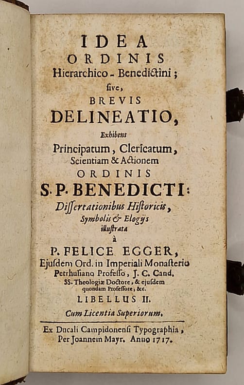 Ex Ducali Campidonensi Typographia [Kempten], Per Joannem Mayr, 1717 ; petit et fort in-8° relié plein veau brun (reliure légèrement postérieure, épidermures), dos à nerfs (tomaison et titre manuscrits estompés au dos, petite perforation en tête, sans gravité), double fermoir métallique avec languette de cuir, tranches mouchetées de rouge, ex-libris moderne, certains feuillets légèrement brunis, 771-(15) pp. Cet exemplaire constitue le second tome d'un ensemble de deux (le premier ayant été publié en 1715). Titre-frontispice absent, quatre belles planches gravées en taille-douce (dont deux signées « I. H. Storcklin »), lettrines, culs-de-lampe. On doit ce manuel illustré à Felix Egger (1659-1720), religieux bénédictin de Bavière et éminent historien de son ordre.