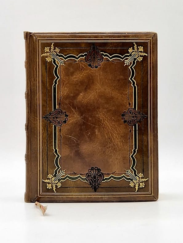 Paris/Limoges, J. Depelley, s. d. [c. 1880] ; in-12 relié plein veau glacé, dos à nerfs orné, beau décor végétal estampé vert, rouge et or au plat supérieur, tranches dorées, roulette intérieure, gardes de moire verte, frontispice et titre-frontispice, large encadrement historié noir et sépia, avec vignettes, à chaque page, trois planches hors texte, 500 pp.
