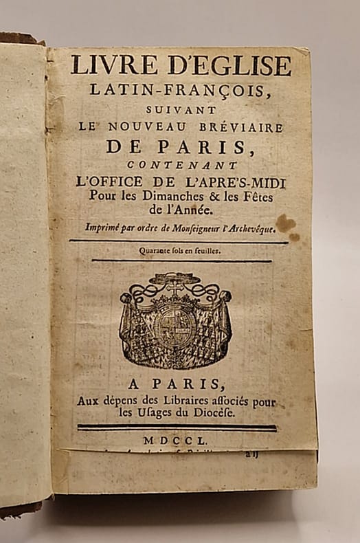 Paris, Aux dépens des Libraires associés pour les Usages du Diocèse, 1750 ; in-12 relié pleine basane racinée (petite galerie de ver sur un mors, frottée par endroits, sans fragilité), dos lisse, tranches mouchetées, vignette de titre (armes), manque de papier dans la partie inférieure de la page de titre, (12)-600-CXXVI-(4) pp.