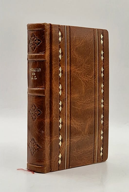 Paris Pouget-Coulon sans date vers 1900. Petit in-12 étroit (14cm x 7cm) 544pp. Maroquin brun bradel orné d'un filet à froid d'encadrement sur le dos et les plats,coupes filetées, belle dentelle dorée sur bordure intérieure, contreplats et gardes doublés de moire ivoire avec belle initiales dorées "J.B" datées du 17 mai 1900. texte dans une jolie guirlande de végétaux et de pampres, 2 gravures hors texte dont le frontispice. Petite coupure avec ou sans petit manque en marge latérale des pages 365 à 384. Bel exemplaire frais et bien relié. (4904)