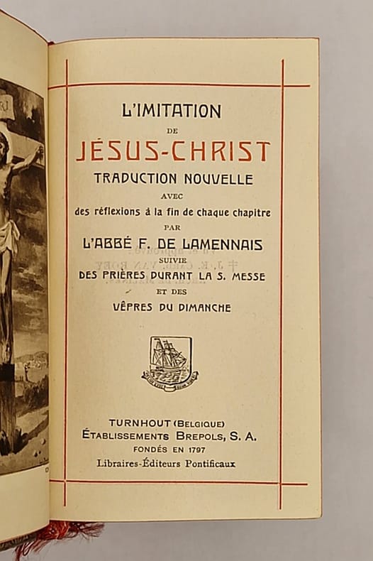 Imitation de Jésus-Christ. Traduction nouvelle avec des réflexions à la fin de chaque chapitre par l'Abbé F. de Lamennais suivie des prières durant la Sainte Messe et des vêpres du dimanche. (Limoges: G. Droguet et R. Ardant, [1915]). [M.C.: religion, christianisme]