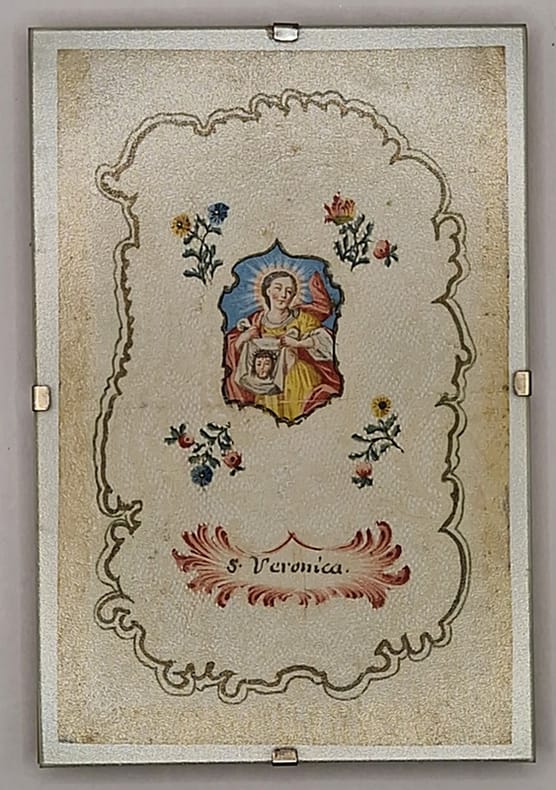 Canivet du XVIIIe siècle (14 x 9 cm) présenté sous verre rehaussé manuellement de couleurs, représentant sainte Véronique tenant dans ses mains le voile sur lequel se serait imprimé le visage du Christ après qu'il a servi à lui éponger front.