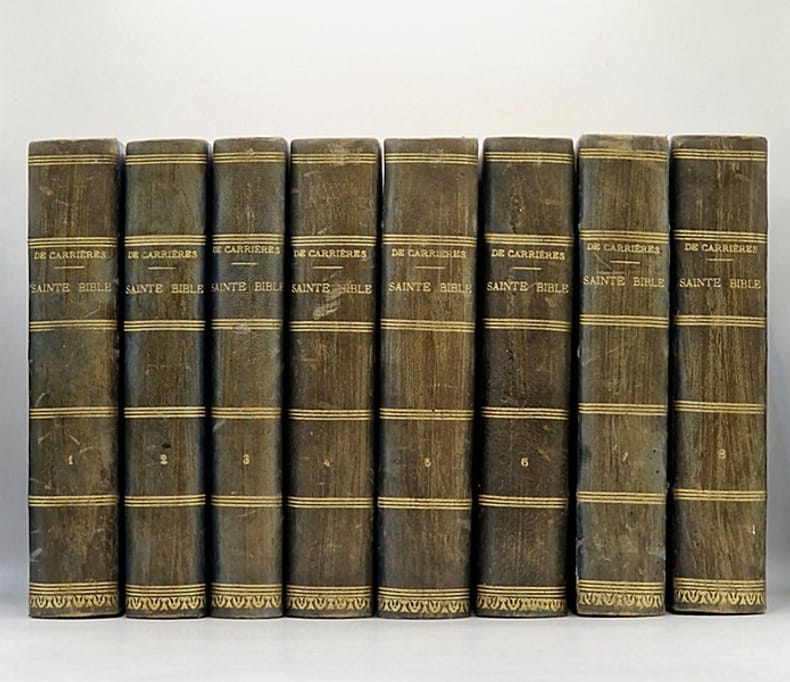 Paris, Gaume Frère/J. Leroux et Jouby, 1854 ; 6 vol. in-8° reliés plein vélin XIXe (petite fente sur un mors du tome VI, sans fragilité), dos à nerfs, tranches rouges, quelques rousseurs et mouillures claires ne masquant pas le texte, texte sur deux colonnes, texte latin et traduction en regard. Bon exemplaire. Complet.