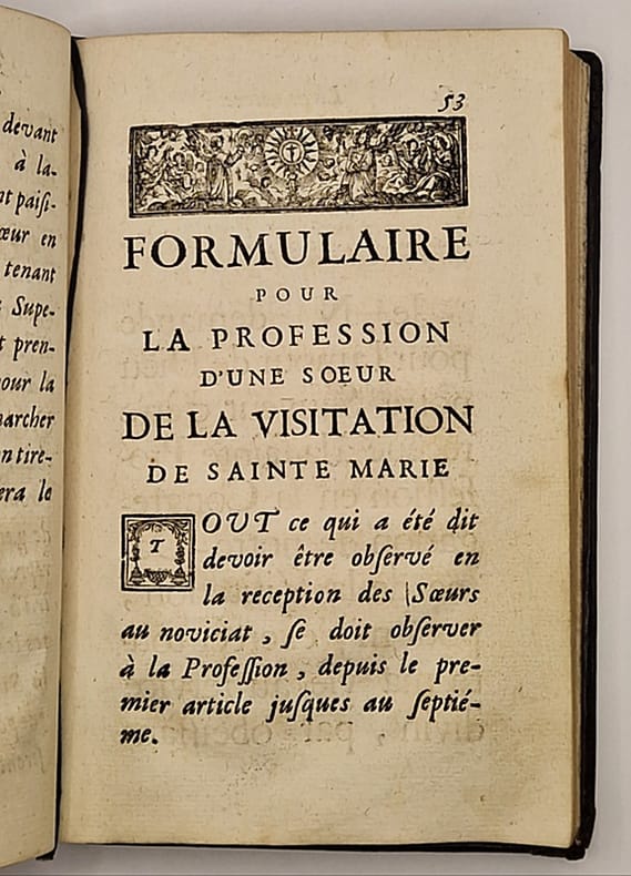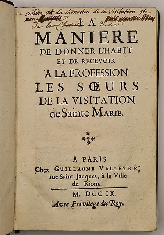 Paris, Guillaume Valleyre, 1709 ; in-8° relié pleine basane noire (un mors fendu sur 6 cm, coiffe inférieure ébréchée), dos à nerf muet, ex-libris manuscrit ancien (Visitation de Nevers), quelques pages tachées (notamment de cire), un papillon p. 60, une petite annotation récente p. 152, culs-de-lampe, lettrines et bandeaux, 198 pp.