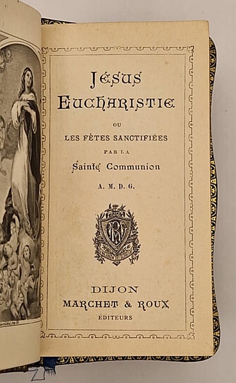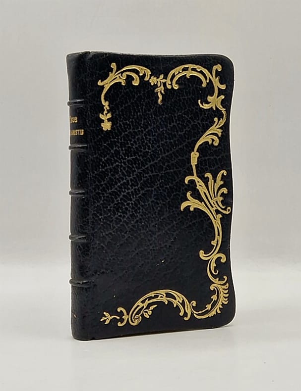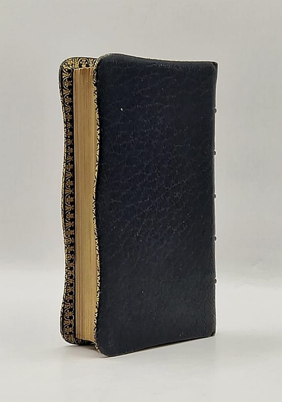 Dijon, Marchet et Roux, 1897 ; in-16 relié plein maroquin bleu nuit, plats festonnés, décor de rinceaux dorés sur le premier plat, champs ornés, tranches dorées, roulette intérieure, gardes de moire bleu électrique, frontispice, encadrement en équerre à chaque page, 191 pp.