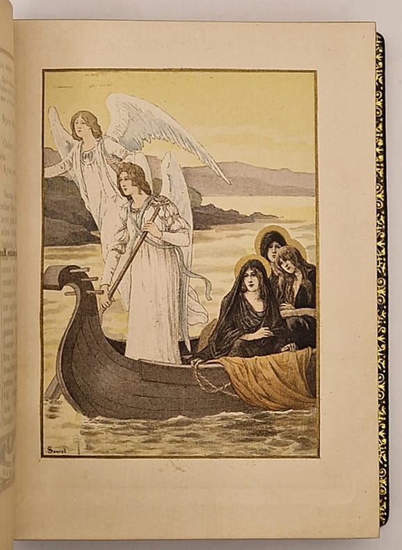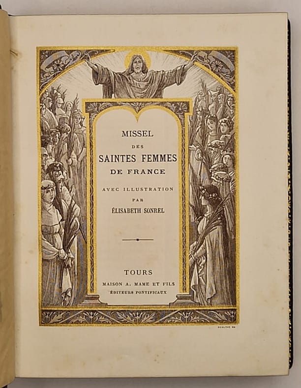 Tours, Alfred Mame et Fils, 1900 ; in-8° relié plein maroquin brun (légèrement frotté par endroits), dos lisse, tranches dorées et marbrées, large dentelle intérieure, gardes de moire beige, 319 pp. Ce bel ouvrage illustré avec élégance par Mademoiselle Sonrel présente dix superbes gravures chromolithographiées hors texte (dont le frontispice). On trouve à chaque page un large encadrement en équerre comportant un décor floral et une vignette représentant une femme illustre de la chrétienté (sainte, religieuse ou mystique) à l'encre brune, sépia ou bleutée avec rehauts dorés.