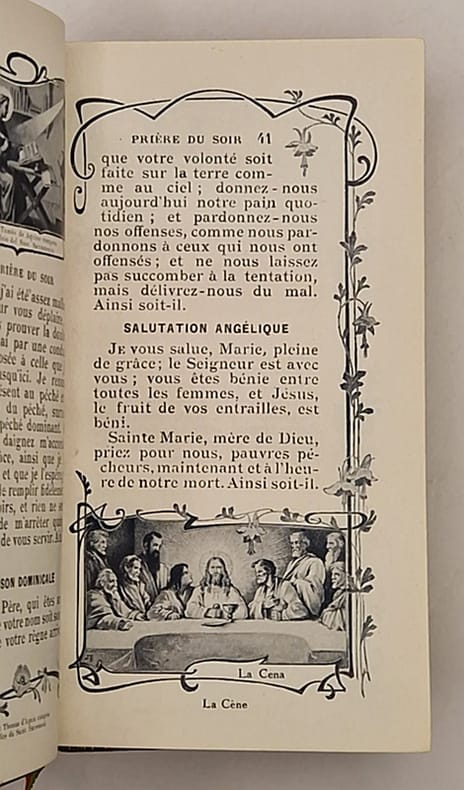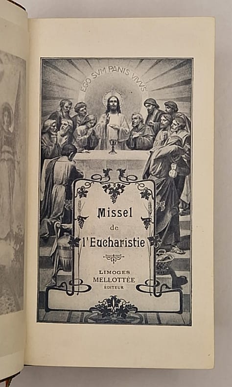 Limoges, Mellottée, s. d. [début du XXe siècle] ; in-12 relié plein veau glacé, dos orné (coiffes légèrement frottées), beau décor estampé et doré sur chaque plat comportant au centre un losange en relief, tranches dorées, large roulette intérieure, gardes de moire ivoire, frontispice et titre-frontispice, encadrement floral et vignette représentant des scènes en relation avec l'Eucharistie à chaque page, 320 pp.