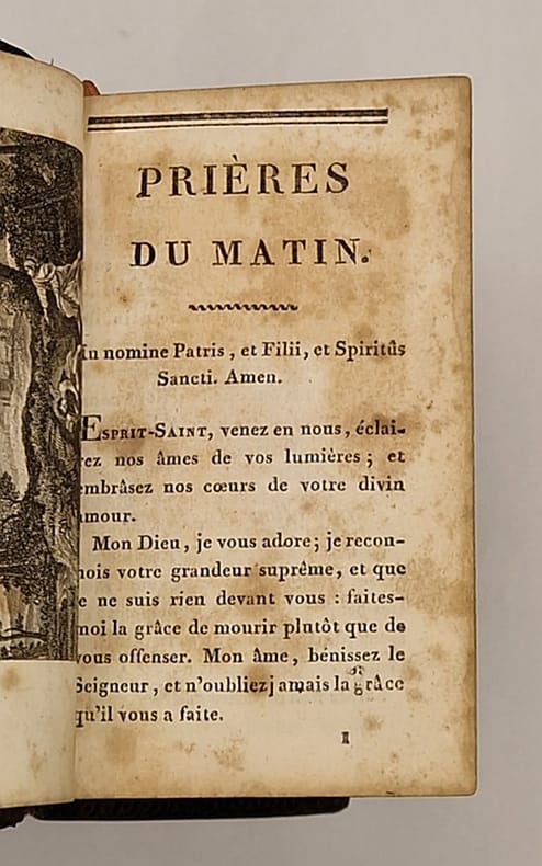 Paris, Saintin, s. d. [c. 1810-1830] ; in-16 relié plein maroquin vert obscur à grain long (deux coins usés, frotté par endroits), dos lisse richement orné, encadrement floral doré sur chaque plat, tranches dorées, manque de papier à l'angle inférieur des pp. 11-12, 13-14 et 27-28 (avec atteinte du texte), pages brunies, gravures hors texte, XXXII-270 pp.