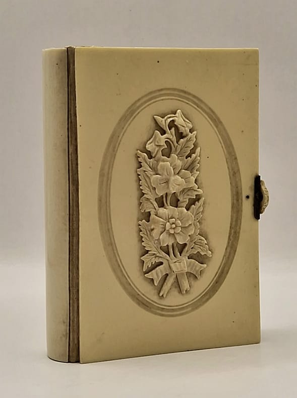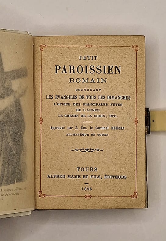 Tours, Alfred Mame et Fils, 1896 ; in-16, reliure en bakélite, beau décor floral en ivoire appliqué au centre du premier plat, fermoir, frontispice gravé, 320 pp.