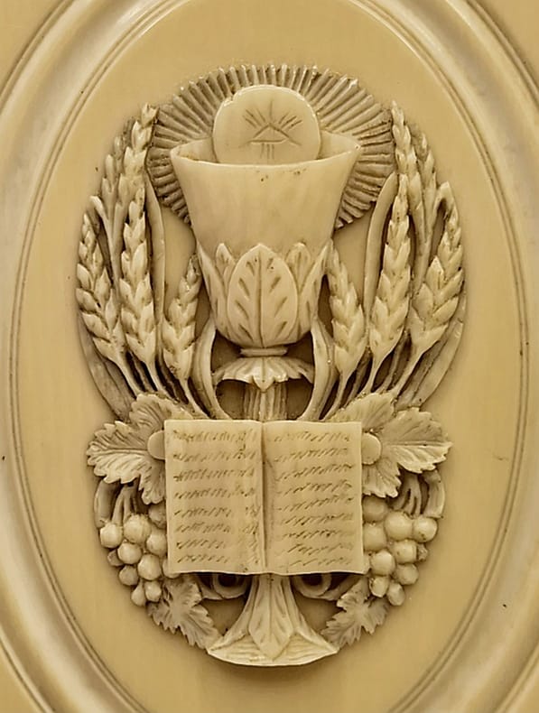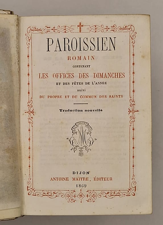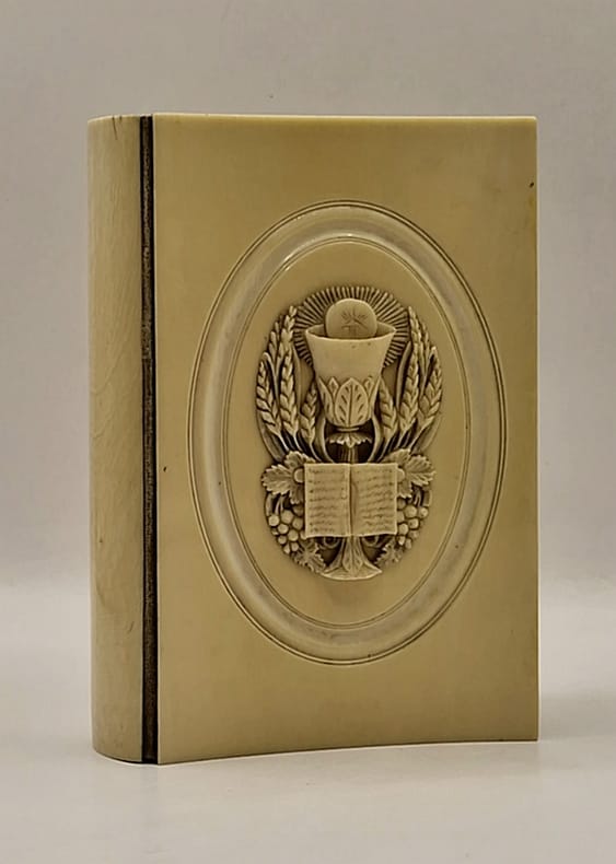 Dijon, Antoine Maitre, 1869 ; in-16, reliure d'époque en ivoire comportant, au centre du premier plat, un beau décor sur le thème de l'Eucharistie en relief finement ouvragé, coin inférieur du second plat écorné, tranches dorées, quatre gravures chromolithographiées (dont frontispice), 592 pp.
