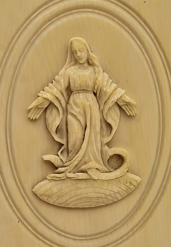 Tours, Alfred Mame et Fils, 1869 ; in-16, plats et dos d'ivoire ; on trouve sur le premier plat un beau médaillon en relief représentant la Vierge Marie écrasant le Serpent, mors de tissu légèrement piqué, fermoir métallique ouvragé, tranches dorées, titre-frontispice chromolithographié, quatre gravures (dont frontispice), 576 pp.