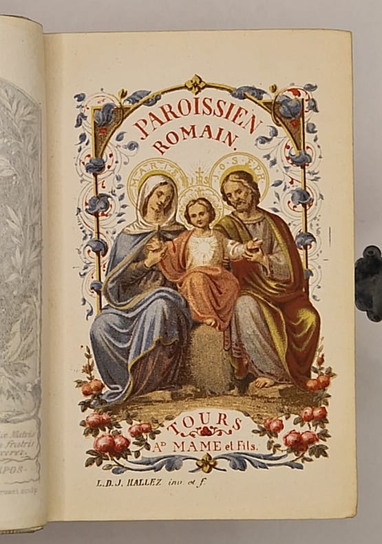 Tours, Alfred Mame et Fils, 1884 ; in-16 relié, plats et dos en ivoire, croix en relief rapportée sur le premier plat, fermoir métallique ouvrage, tranches dorées, titre-frontispice chromolithographié représentant la Sainte Famille, trois gravures hors texte (dont frontispice), 512 pp.