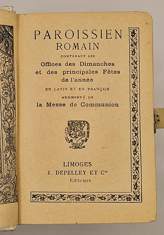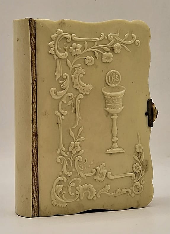 Limoges, J. Depelley, 1914 ; in-16, reliure en bakélite blanche festonnée, bas-relief floral avec motif eucharistique sur le premier plat, fermoir, tranches dorées, deux planches gravées hors texte (dont frontispice), 320 pp.