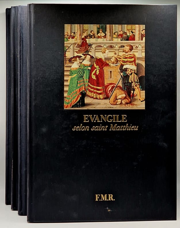 Milan, Franco Maria Ricci, 2004 ; 4 vol. in-4° reliés pleine toile, sous coffret d'origine (légèrement sali), belle illustration tirée du retable de Montbéliard sur le premier plat de chaque volume, papier bleu, texte latin et traduction française en regard. Complet. Très nombreuses reproductions en couleurs des 157 panneaux du retable de Montbéliard.