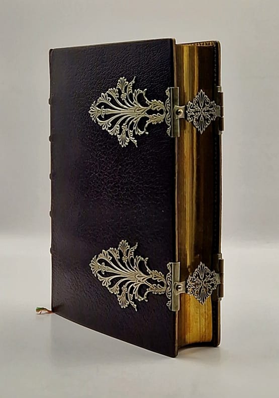 Paris, Gruel et Engelmann, 1858 ; in-12 relié plein maroquin lie-de-vin, reliure d'Augustin Petit, dos à cinq nerfs, double fermoir argent comportant, sur chaque plat, de beaux et larges appendices ouvragés, tranches dorées et marbrées, gardes de moire bordeaux, large roulette intérieure dorée, texte illustré à chaque page d'un large encadrement d'inspiration médiévale, deux gravures hors texte, 703 pp. Accompagné d'un coffret cartonné et toilé rouge récemment conçu sur mesure. Très bel exemplaire.