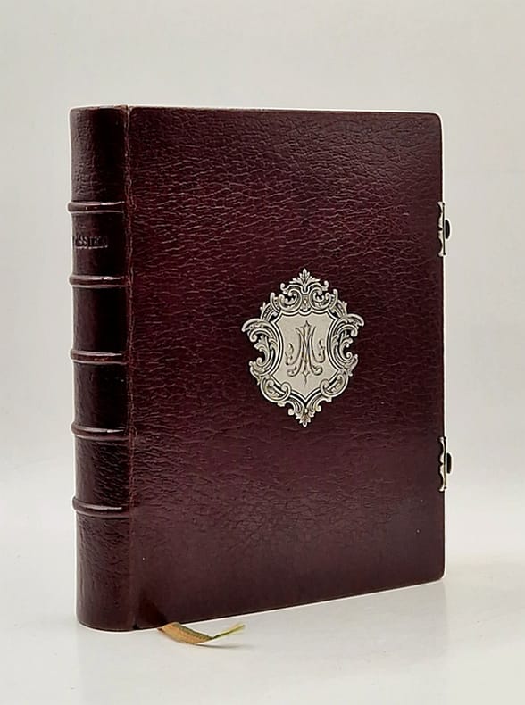 Paris, Gruel et Engelmann, 1858 ; in-12 relié plein maroquin prune, dos à nerf, reliure d'Augustin Petit, plaque d'argent finement monogrammée « M. A. » au centre du premier plat, double fermoir d'argent niellé, tranches dorées sur marbrure, gardes de moire prune, large dentelle intérieure dorée, beau frontispice chromolithographié représentant saint Marc, titre-frontispice, quelques rousseurs éparses, texte illustré à chaque page d'un large encadrement d'inspiration médiévale, deux gravures hors texte, 703 pp. Accompagné d'un coffret cartonné et toilé bordeaux récemment conçu sur mesure.
