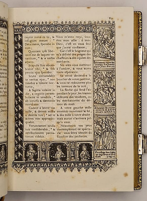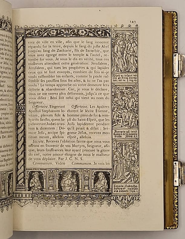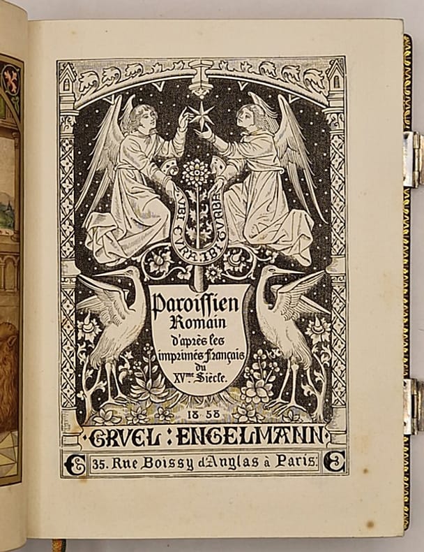 Un beau frontispice et encadrements décorés sur bois page à page d'après des gravures anciennes. Beau paroissien imprimé sur papier vergé. (Un mors en partie fendillé).