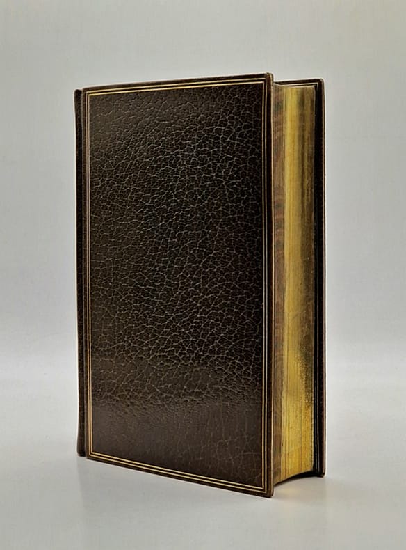 Paris, Gruel et Engelmann, 1883 ; in-12 relié plein maroquin brun, dos plat orné d'un double encadrement de filets dorés, encadrement de double filet doré sur les plats, tranches dorées sur marbrures, gardes de moire brune, large encadrement de filets dorés, six belles gravures hors texte (dont frontispice), on trouve à chaque page un bel encadrement à la manière des décors gravés du XVIe siècle, 631 pp. Accompagné d'un coffret cartonné et toilé brun, récemment conçu sur mesure. Très bel exemplaire.