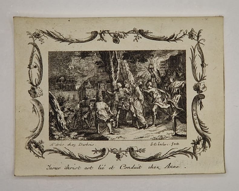 Paris, Derbois, s. d. [fin XVIIe début XVIIIe siècle], 12,9 x 9,8 cm. Gravure au burin signée « S. C. Leclerc. » représentant Jésus conduit chez Hanne avant qu'on l'envoyât chez Caïphe.