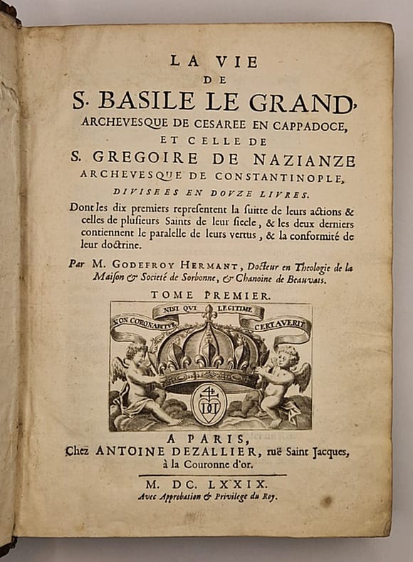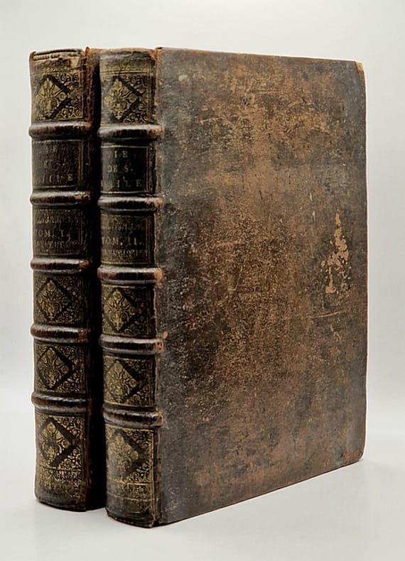 Paris, Antoine Dezallier, 1679 ; 2 vol. in-8° reliés plein veau de l'époque (deux coins émoussés, épidermures superficielles sur les plats), dos à nerfs richement ornés (trois coiffes absentes), belles vignettes de titre, ex-libris anciens dont deux datés de 1732, lettrines et culs-de-lampe, quelques mouillures claires dans les marges des deux tomes, portrait-frontispice absent, (14)-653-(1) et 578 pp. On trouve en tête de chacun des douze livres qui composent ce remarquable ouvrage un magnifique bandeau historié, en taille-douce, de Pierre Lepautre ou Pierre Brissart. Godefroy Hermant (1617-1690) était un théologien janséniste.