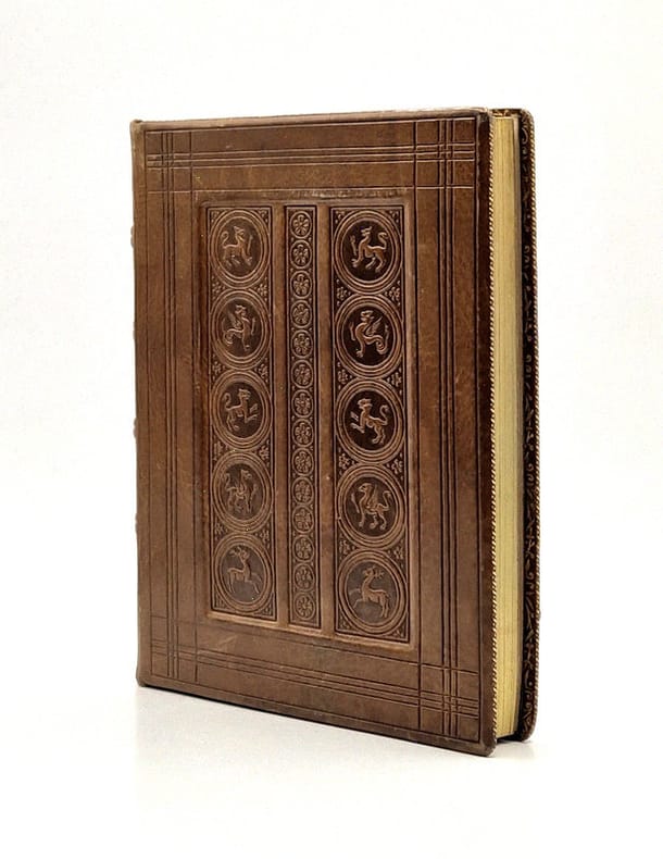 Tours, Alfred Mame et Fils, 1895 ; in-12 plein maroquin brun (épidermures aux plats), dos à nerfs, monogramme en argent au plat supérieur, tranches dorées et marbrées, roulette intérieure, gardes de moire verte, frontispice et titre frontispice, 5 gravures hors texte et large encadrement à chaque page illustrant principaux faits de la vie de la Vénérable Jeanne d'Arc, 431 pp. Nota : Jeanne d'Arc a été béatifiée en 1909, soit 14 ans après la publication de ce bel ouvrage.