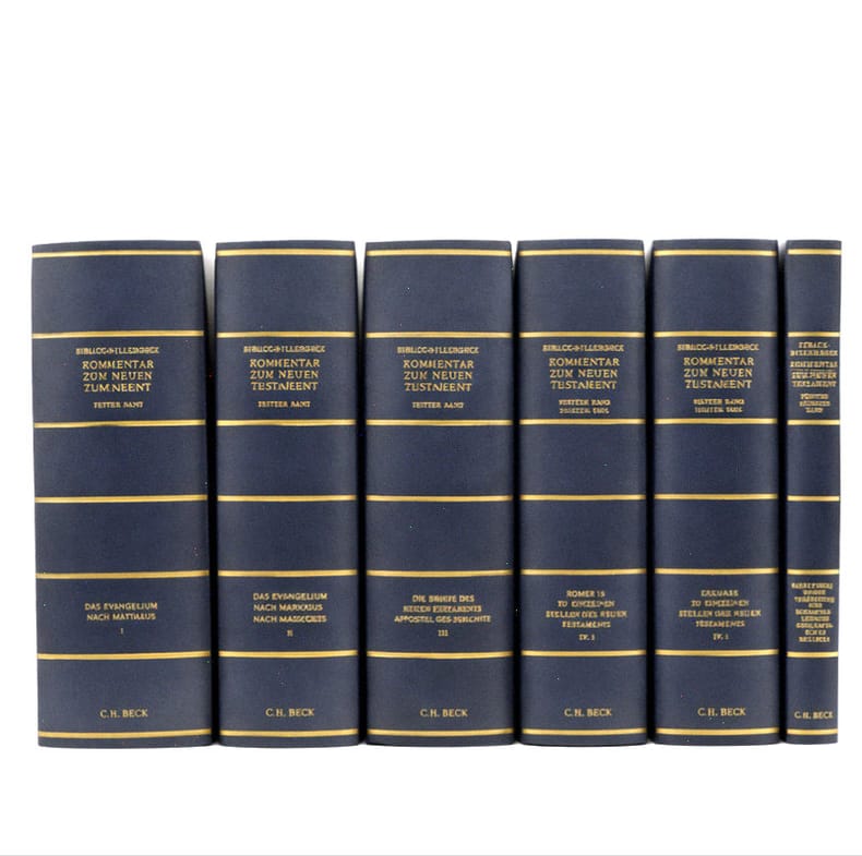 C. H. Beck'sche Verlagsbuchhandlung Oskar Beck in8. Sans date. Cartonné. Kommentar zum neuen Testament aus Talmud und Midrasch. Band 1 bis 4. [Von Hermann L. Strack und Paul Billerbeck]. - Band 1: Das Evangelium nach Matthäus. - Band 2: Das Evangelium nach Markus Lukas und Johannes und die Apostelgeschichte. - Band 3: Die Briefe des neuen Testaments und die Offenbarung