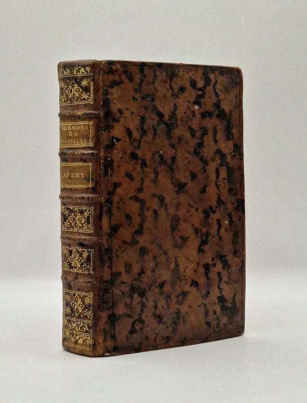 1707 reliure plein veau in-octavo, dos 5 nerfs - entre-nerfs à fleuron au centre avec des petits fers isolés en remplissage et des feuillages exécutés aux filets courbes aux angles - pièce de titre avec filet or sur fond grenat, coiffe supérieure défraîchie, plats légèrement frottés, molettes sur la tranche des plats, toutes tranches dorées, marque page en tissu, illustrations : 1 portrait en frontispice + sur la page de titre + bandeaux + lettrines et culs-de-lampe, 546 + 76 pages de Table des Sermons, 1707 à Paris Chez Rigaud Directeur de l'Imprimerie,