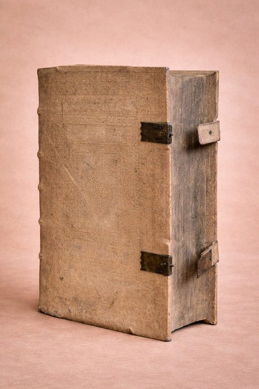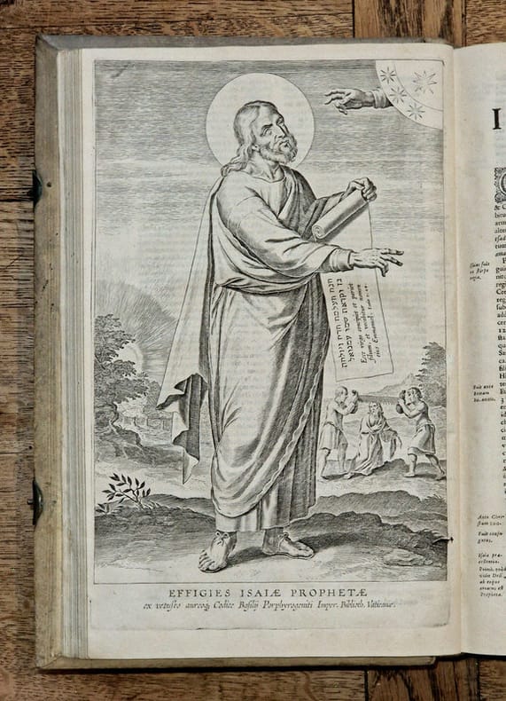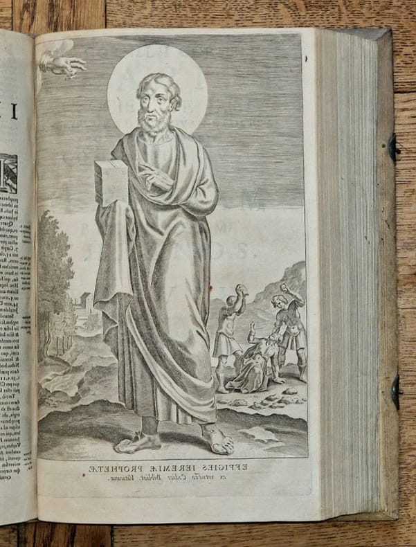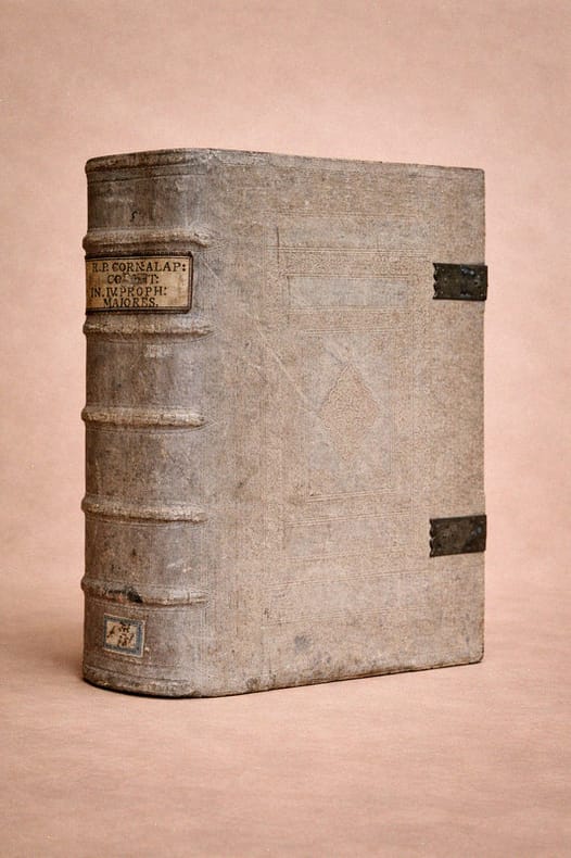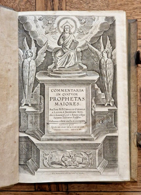 Antverpiae [Anvers], Apud Henricum & Cornelium Verdussen [Henri et Cornelius Verdussen], 1703 ; in-4 relié pleine truie sur ais de bois – reliure légèrement biseautée –, dos à nerfs (petite étiquette en pied de volume), pièce de titre de vélin, plats estampés d'une belle composition de roulettes et de rinceaux, restes de deux fermoirs de cuir dont un en partie manquant, ex-libris moderne, lettrines (certaines historiées), bandeaux, culs-de-lampe et vignettes gravés, texte sur deux colonnes, (39)-1414-(90) pp. Grand titre-frontispice monumental représentant le Christ en gloire, assis sur un trône et entouré de deux séraphins, conformément à la vision d’Ézéchiel (Ez 1, 26-27). En partie inférieure figure une petite illustration d’Isaïe 6, 6 : « En même temps l'un des séraphins vola vers moi, tenant en sa main un charbon de feu qu'il avoit pris avec des pincettes de dessus l'autel. » Grands et bons portraits d'Isaïe, Jérémie, Ézéchiel et Daniel gravés en tête de chacune des quatre parties du commentaire de Cornelius a Lapide : p. 42 : Isaïe en pied, au premier plan, et sa mise à mort, scié en deux. p. 562 : Jérémie en pied, au premier plan, et sa lapidation au second plan. p. 926 : Ézéchiel en pied. p. 1254 : Daniel dans la fosse aux lions au premier plan et, dans la partie supérieure, la vision des quatre bêtes monstrueuses décrites au chapitre 7. Cornelissen van den Steen ou Cornelius a Lapide (1567-1637) était un théologien jésuite flamand. Ses commentaires s'appuient principalement sur les études des Pères de l'Église et des grands commentateurs qui l'ont précédé. Les commentaires de Cornelius a Lapide, en premier lieu destiné aux prédicateurs, revêt une importante dimension pastorale et spirituelle (voir DSA, IX, col. 253 ss.). Saint-Cyran lui doit une large part de sa profonde connaissance de l'Écriture.