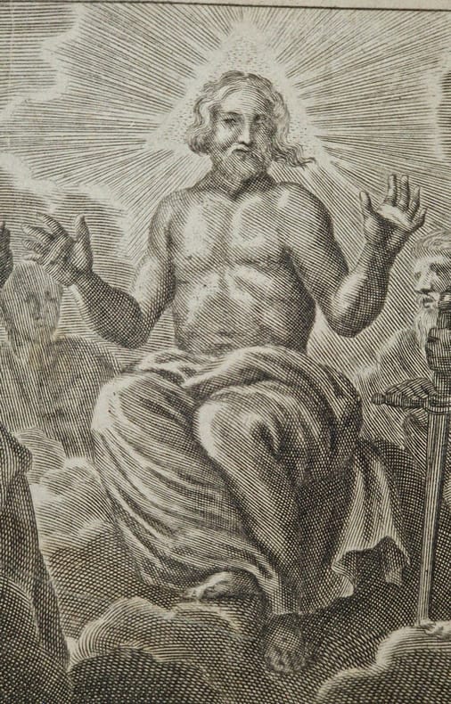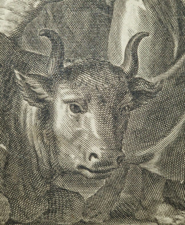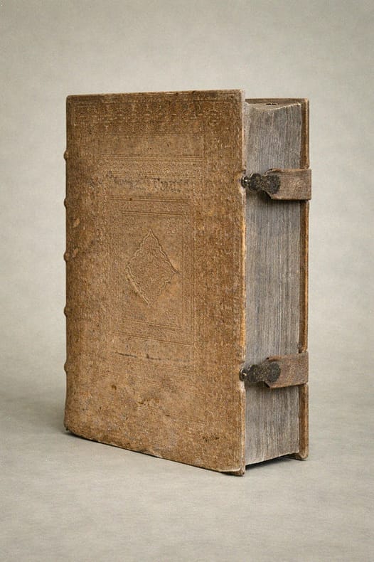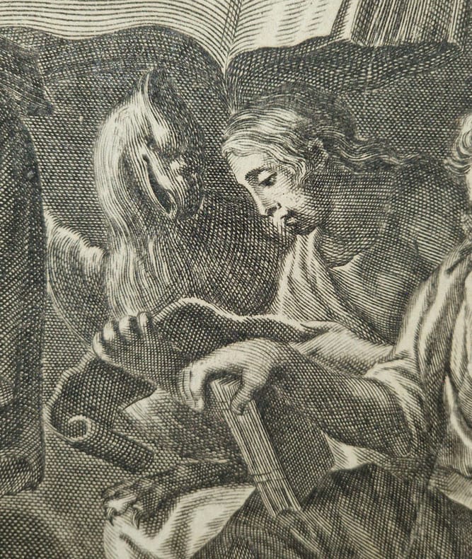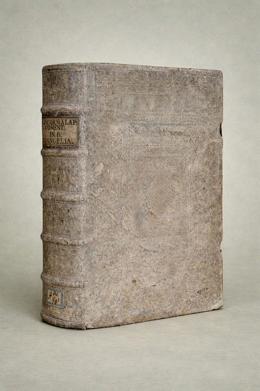 Antverpiae [Anvers], Apud Henricum & Cornelium Verdussen [Henri et Cornelius Verdussen], 1712 ; fort in-4° relié pleine truie sur ais de bois – reliure légèrement biseautée –, dos à nerfs, pièce de titre de vélin, petite étiquette en pied de volume, plats estampés d'une composition de roulettes et de rinceaux, deux fermoirs de cuir et métal fonctionnels, vignettes de titre, culs-de-lampe, deux figures géométriques gravées p. 481, rousseurs éparses, texte sur deux colonnes, (6)-620-(44)-(10)-557-(42) pp. Superbe titre-frontispice représentant les quatre évangélistes accompagnés des créatures symboliques qui leur sont associées ; on trouve dans la partie supérieure le Christ en gloire entouré de la Vierge, Paul, Pierre et d'autres saints – frontispice anciennement renforcé au verso. Cornelissen van den Steen ou Cornelius a Lapide (1567-1637) était un théologien jésuite flamand. Ses commentaires s'appuient principalement sur les études des Pères de l'Église et des grands commentateurs qui l'ont précédé. Les commentaires de Cornelius a Lapide, en premier lieu destiné aux prédicateurs, revêt une importante dimension pastorale et spirituelle (voir DSA, IX, col. 253 ss.). Saint-Cyran lui doit une large part de sa profonde connaissance de l'Écriture.