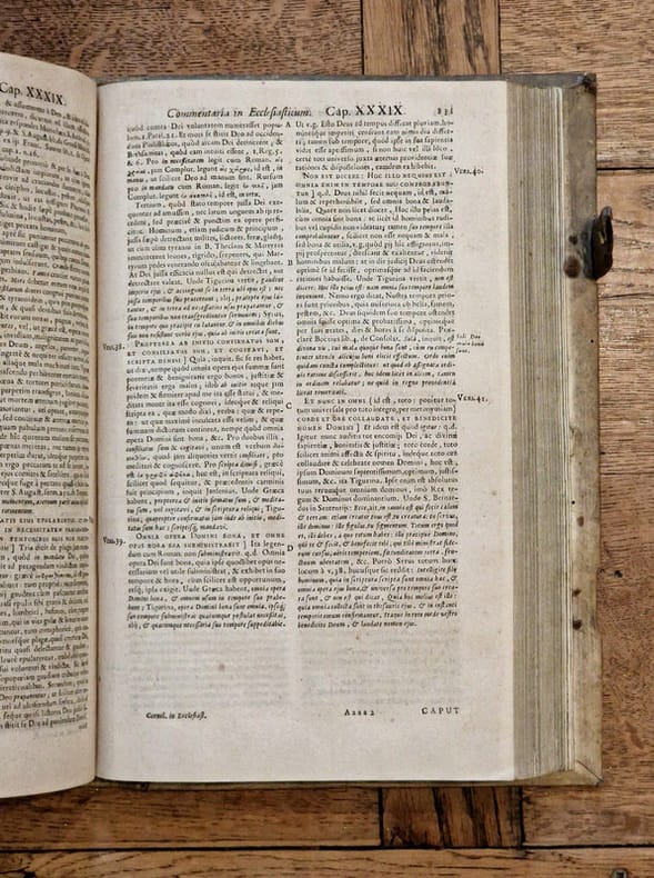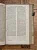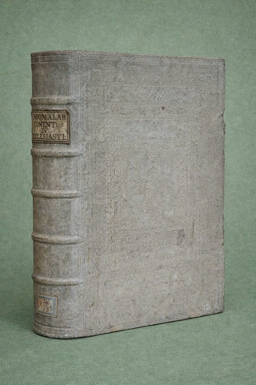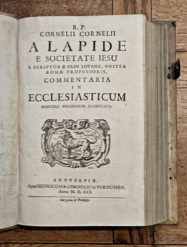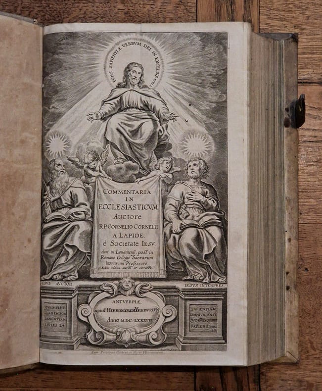 Antverpiae [Anvers], Apud Henricum & Cornelium Verdussen [Henri et Cornelius Verdussen], 1687 ; fort in-4° relié pleine truie sur ais de bois – reliure légèrement biseautée –, dos à nerfs, pièce de titre de vélin, petite étiquette en pied de volume, plats estampés d'une composition de roulettes et de rinceaux, restes d'un fermoir sur deux, ex-libris moderne, vignette de titre, lettrines, culs-de-lampe, texte sur deux colonnes, (6)-1040-(74) pp. Magnifique titre-frontispice signé « C. Galle », illustrant le Christ en gloire transmettant sa parole, source de sagesse, à deux personnages.