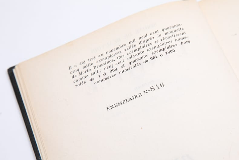 S. l. (Paris), Éditions Gallimard, 1943 ; in-8 (142 x 202 mm), 444 pp., reliure d'éditeur pleine percaline, coloris violet clair, dos lisse, plats estampés et texte doré, sous Rhodoïd, d'après la maquette de Massin. Collection «Soleil», N° 069. Exemplaire numéroté 1569/3100.