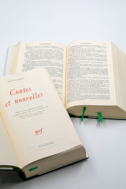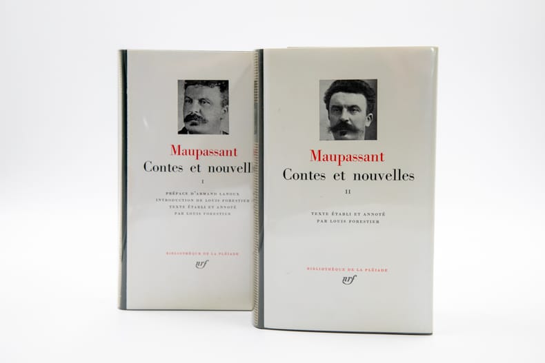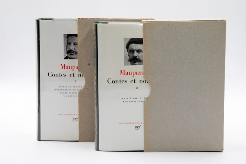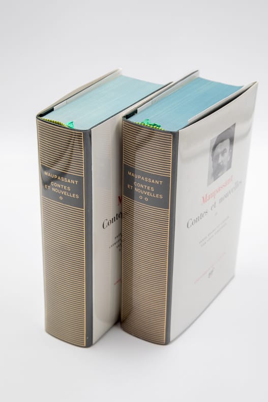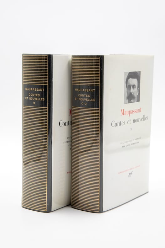 Gallimard NRF "Bibliothèque De La Pléiade", 1977-1979. 2 volumes In-12 reliés (17,5 x 11 cm), reliure éditeur plein cuir vert, dos lisse orné de filets dorés, jaquette blanche imprimée, rhodoïd, étui de carton gris de l'éditeur, 1776-1824 pages - Édition de Louis Forestier. Préface d'Armand Lanoux. Le volume contient : Contes et nouvelles publiés entre 1875 et mars 1884 - Supplément.- Le volume II contient : Contes et nouvelles publiés entre avril 1884 et 1893 - Contes posthumes. Appendice : Contes ajoutés - Supplément. Petit manque en bas d'un rhodoïd, très bon état par ailleurs.