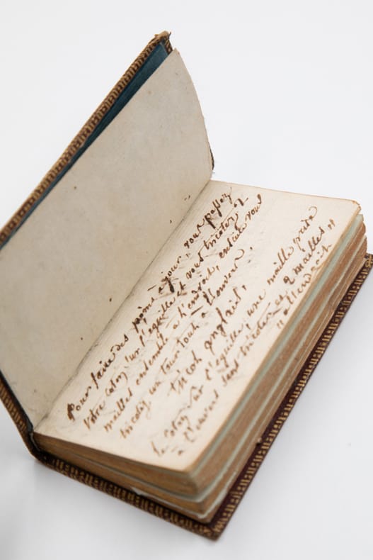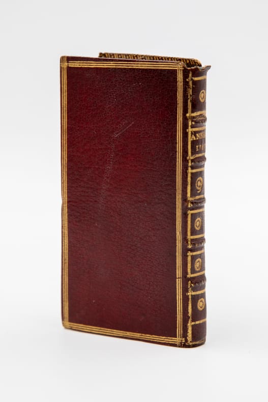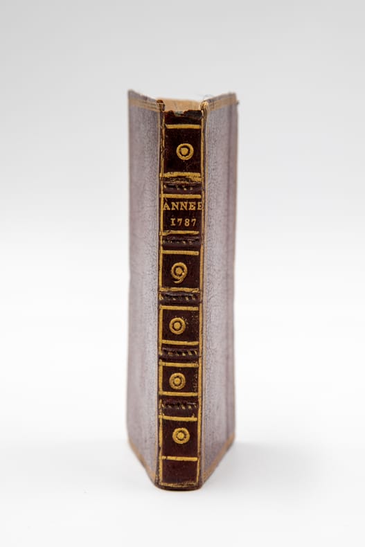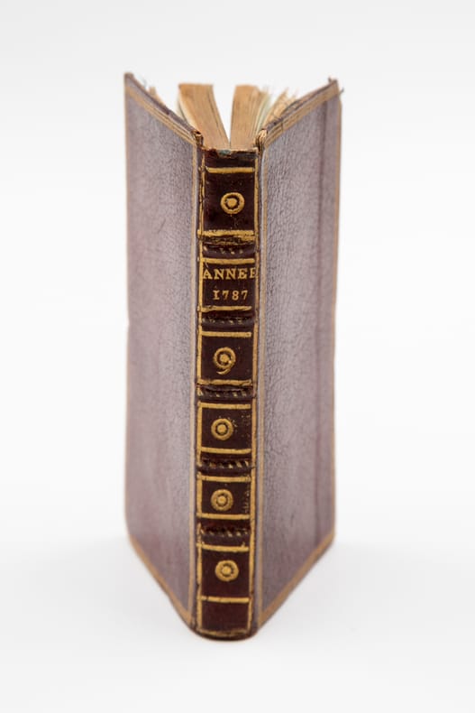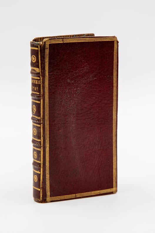 Paris Veuve Hérissant 1787 In-16, plein maroquin rouge de l'époque, dos à nerfs orné, titre doré, triple filet d'encadrement doré sur les plats, frise dorée sur les chasses, tranches dorées (manque à la coiffe supérieure, un coin émoussé), gardes de soie bleue, non paginé, papier bleuté, texte encadré d'un double filet noir, vignette de titre.