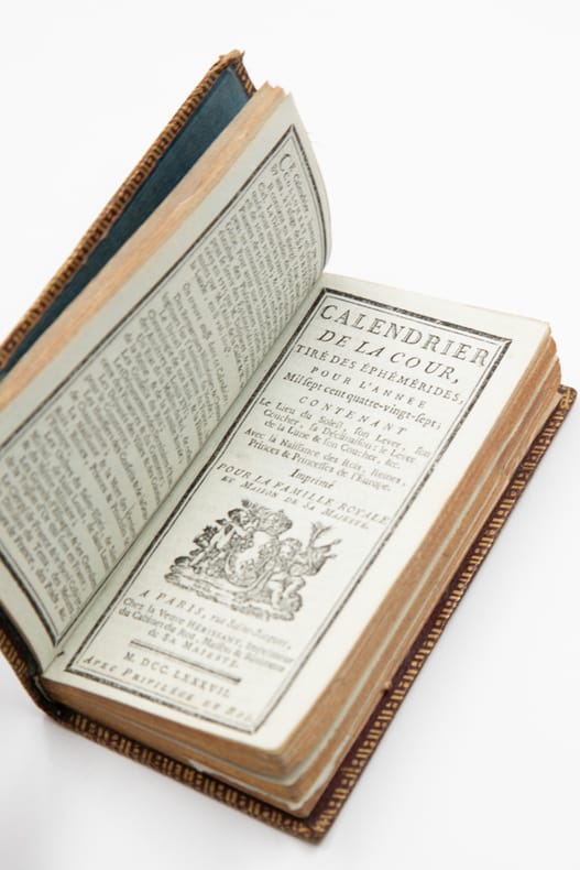 "En outre des renseignements mentionnés sur le titre, on y trouve tout ce qui est relatif à l'organisation du royaume [...] Ce calendrier, comme l'Almanach Royal, est un précieux document pour l'histoire officielle de la Cour" (Grand-Carteret, 92).Charmant exemplaire dans sa reliure d'origine, inscription manuscrite ancienne sur la page de garde, très bon état intérieur.