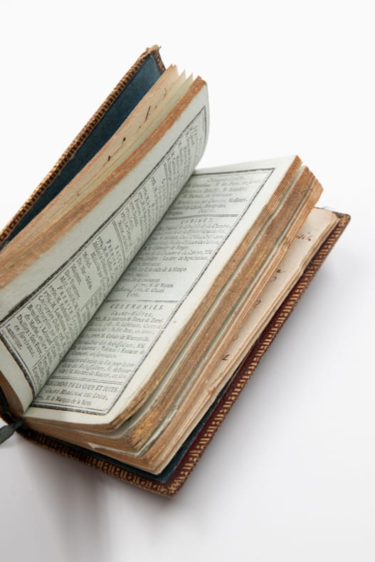 "En outre des renseignements mentionnés sur le titre, on y trouve tout ce qui est relatif à l'organisation du royaume [...] Ce calendrier , comme l'Almanach Royal, est un précieux document pour l'histoire officielle de la Cour" (Grand-Carteret, 92).Charmant exemplaire dans sa reliure d'origine, inscription manuscrite ancienne sur les 3 premiers feuillets, bon état intérieur.