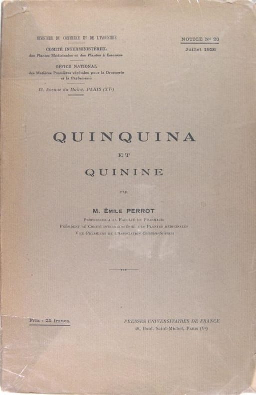 Ministère du commerce et de l’industrie, Paris, 1926. Plaquette grand in/8 brochée, couverture imprimée, 174 pages, 17 illustrations. Petit manque à la couverture, manque de papier sur une illustration. Les quinquinas sauvages d’Amérique, les alcaloïdes du quinquina, les quinquinas de culture, la quinine.