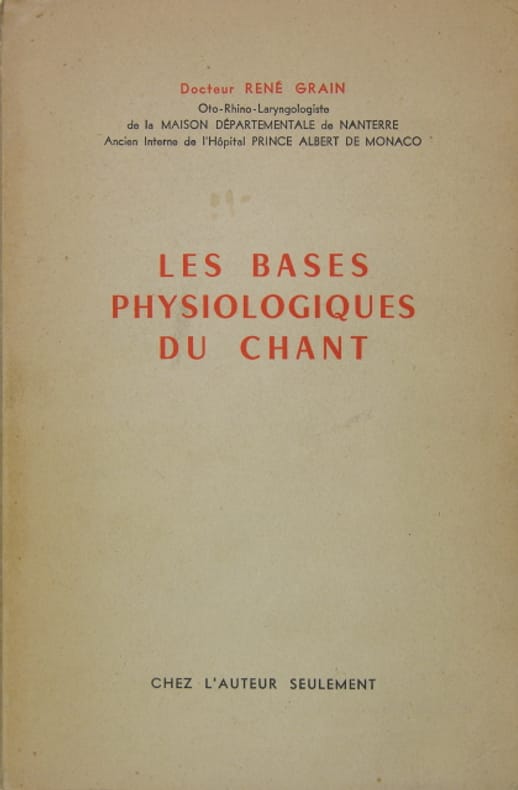 Chez l’auteur, Paris, 1950. Grand in/8 broché, couverture imprimée, figures in et hors-texte en couleur, 268 pages. Envoi de l’auteur. La mécanique laryngée, le fonctionnement de la mécanique laryngée les variations du plan d’émission vocale, les rapports de l’écriture musicale et de la voix chantée, conclusions thérapeutiques, conclusions didactiques.