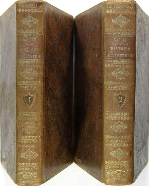 P. Debure, 1781, 24pp., 527pp., 3 PLANCHES DEPLIANTES pour l'histoire de l'astronomie ancienne ; P., Debure, 1779-172, T.1 : 16pp., 728pp., 13 PLANCHES DEPLIANTES, T.2 : (2), 751pp., 5 PLANCHES DEPLIANTES, T.3 : (2), 415pp. pour l'astronomie moderne ; soit 4 VOLUMES in 4 reliés en plein veau marbré, dos ornés de fers dorés, étiquettes rouges et vertes, tranches rouges ou jaspées (reliures de l'époque), (une coiffe légèrement usée, petite épidermure sans gravité sur un plat à un volume, quelques rousseurs éparses, un cahier uniformément roussi)