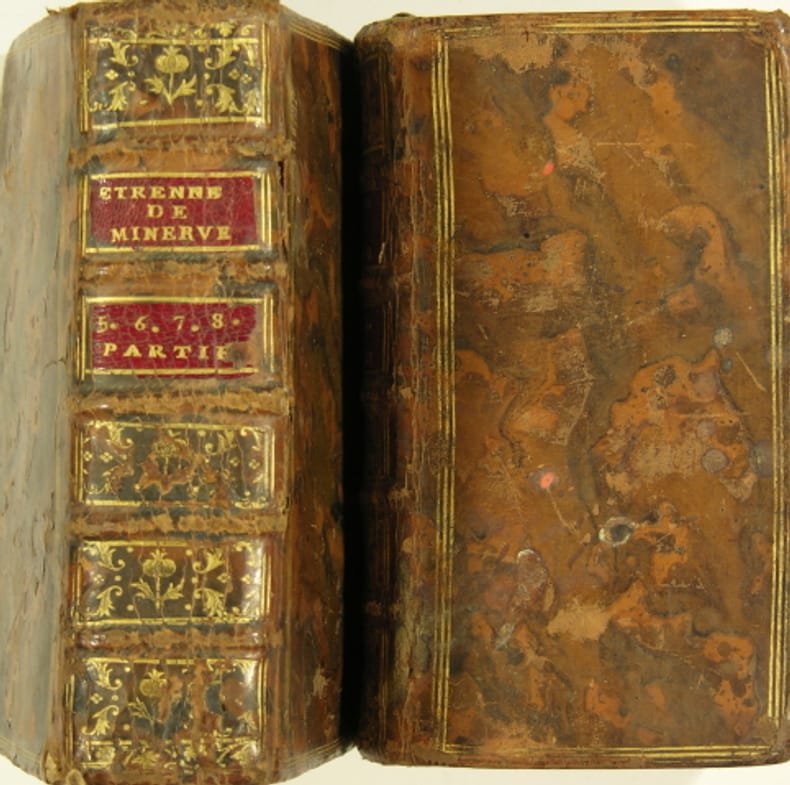 2 fat vol. 16mo in full contemporary marbled calf, gilt panels and red labels on spine. Few flaws : upper tips worn, vol 2 : wormholes on joint ; rear corners hardly worn. Containing numerous receipts for drawing (pastels) & painting (restauration, colours...), to remove stains, remedies for men & animals, esoterism...Manuel de "trucs" d'artistes (fabriquer ses couleurs, raviver les ors, comment rendre le volume d'une rose en peinture, le rendu d'une perle, d'une étoffe...), d'artisans (colorer le bois, graver le métal...), falsifications (encres invisibles, encres de couleurs, reconnaître les pierres précieuses...), conservation des aliments, soins aux animaux, ésotérisme (baguette divinatoire !)... Fermeture de la Librairie du 30/12/2025 au 11/01/2026